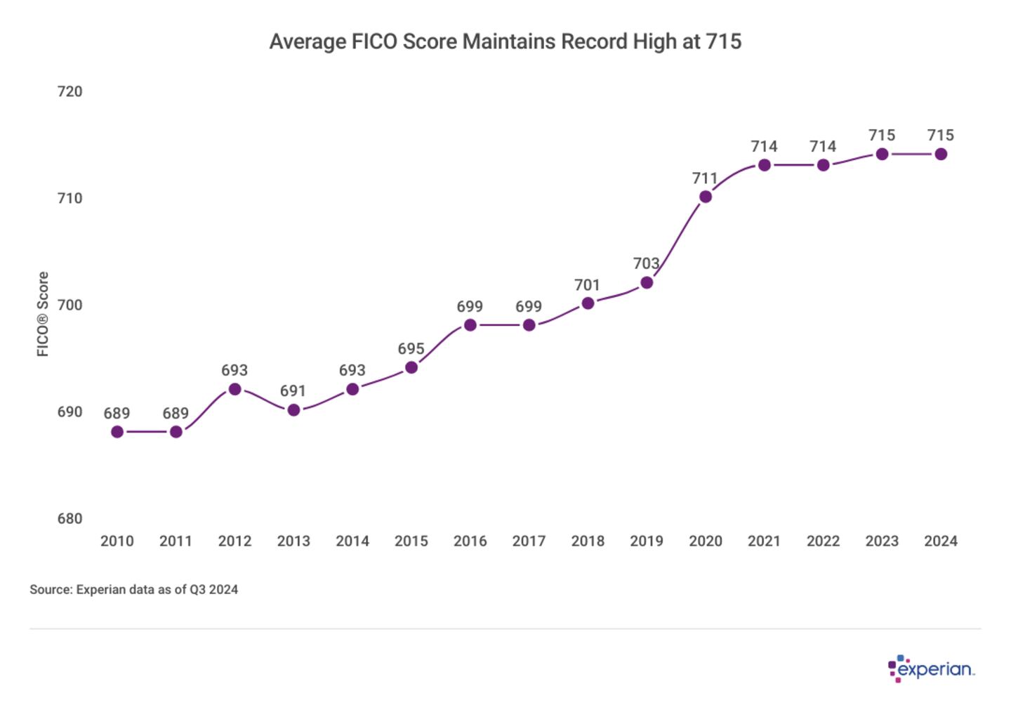 Credit scores remained broadly stable for most consumers in 2024. As of Q3, the average FICO® Score in the U.S. was 715, unchanged from the same period in 2023.