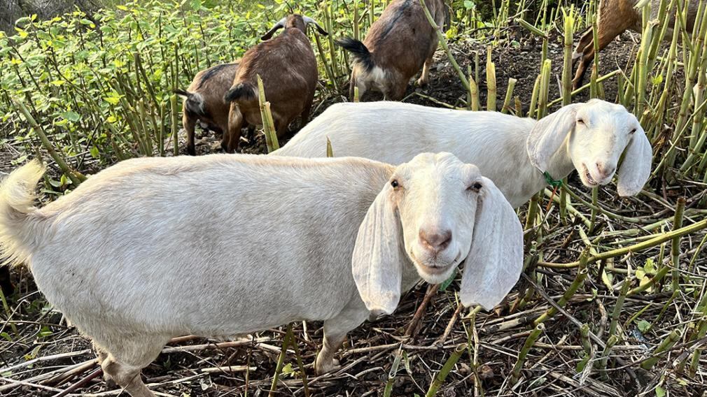 There are challenges in asking goats to come to work for you. They have thin pelts and need shelter, which means in cold winter weather they aren't able to work out in the open. They are able to break down seeds of invasive plants in their stomachs, so what is excreted does not spread the species they're eating, but this also makes them susceptible to parasites such as stomach worms.