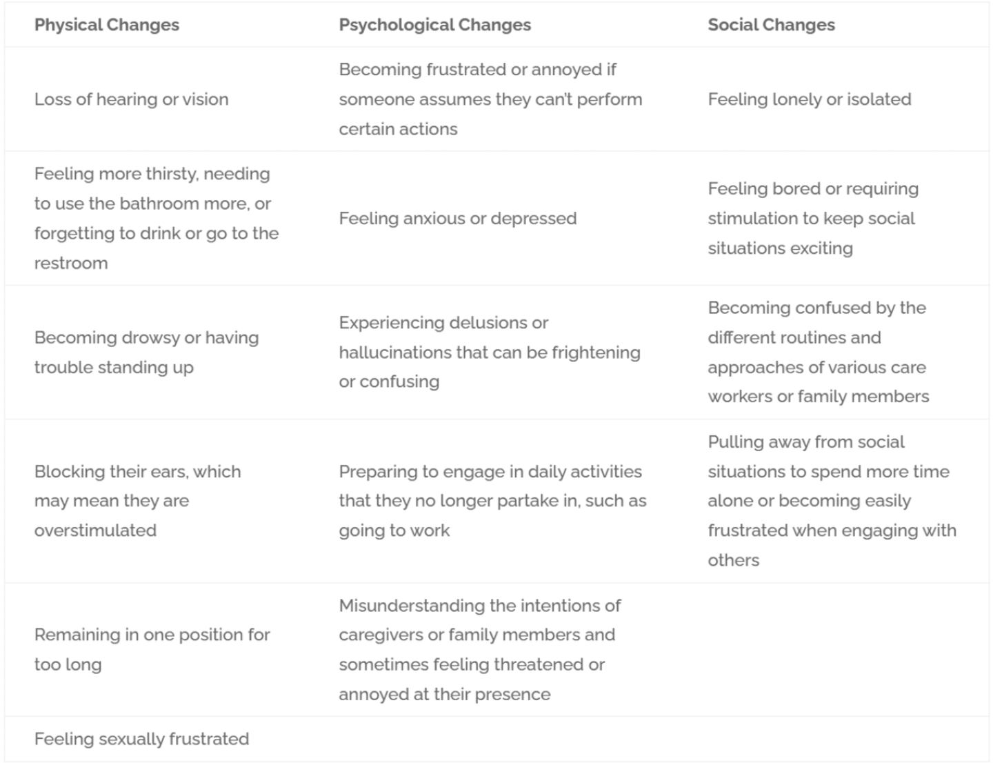 People have the same basic physical, psychological, and social needs. Dementia affects language processing and production, making it difficult for individuals to communicate or address their needs. As their family member, you may notice the following physical, psychological and social changes: