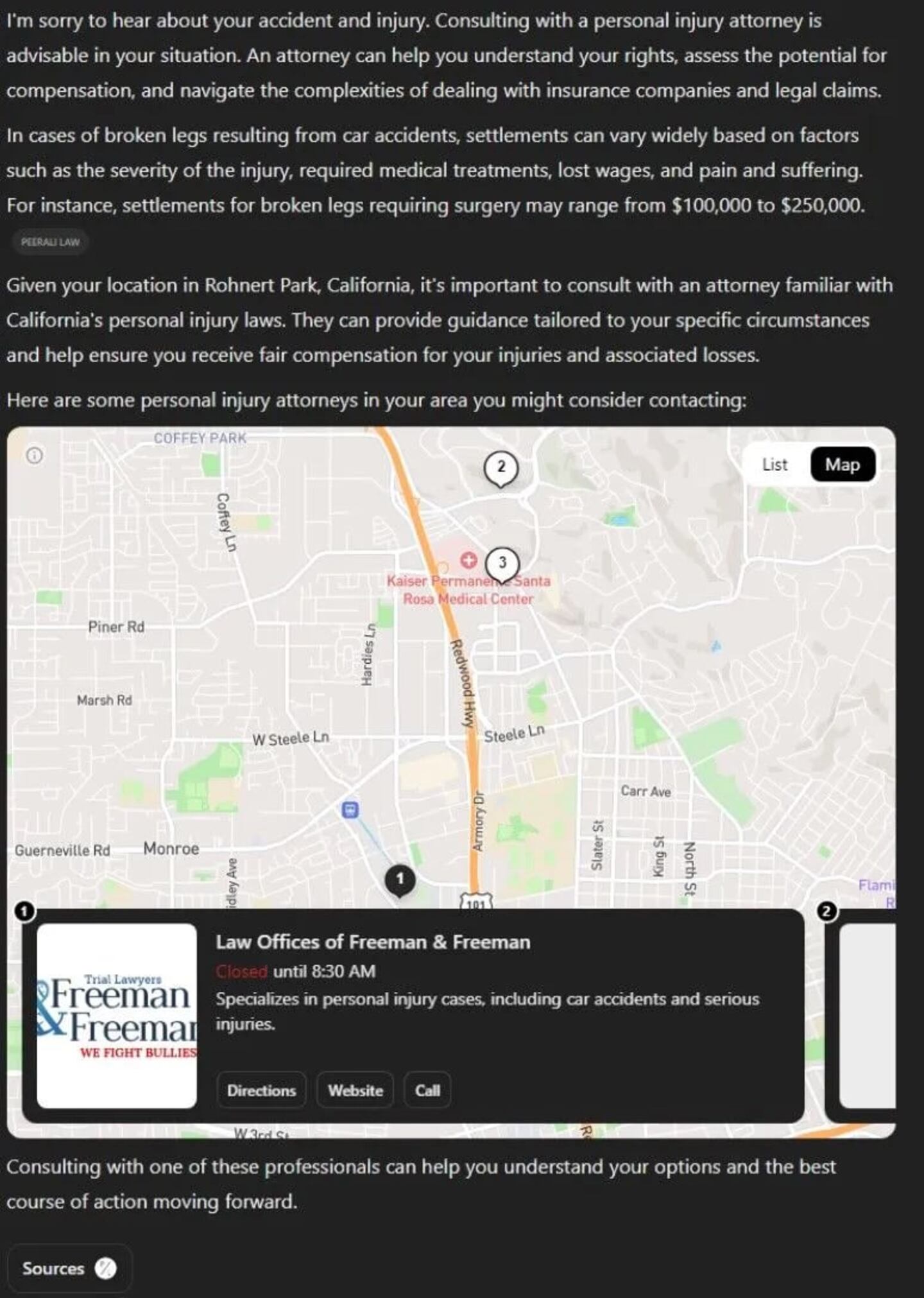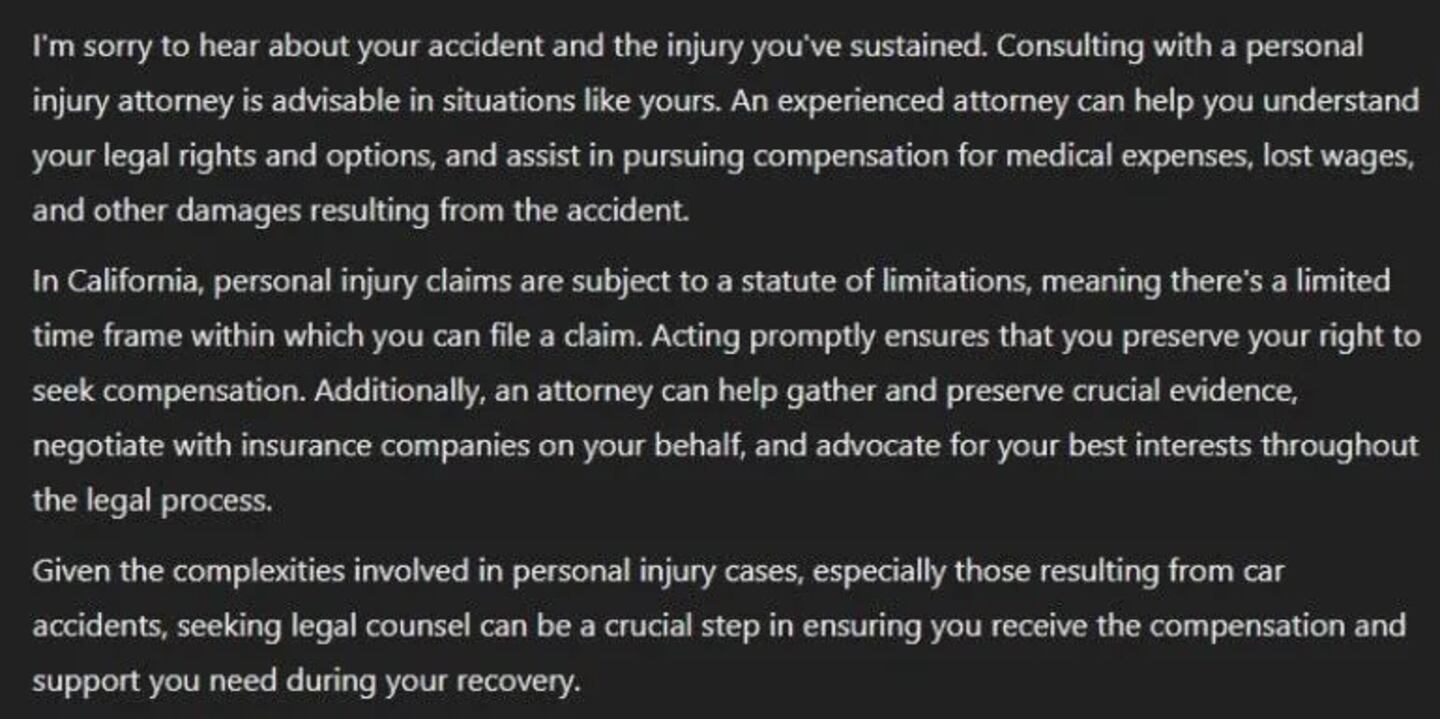 Here is an example of searching for "I was in a car accident and suffered a broken leg. Should I talk to an attorney?" Consultwebs asked this three times and got three very different answers.