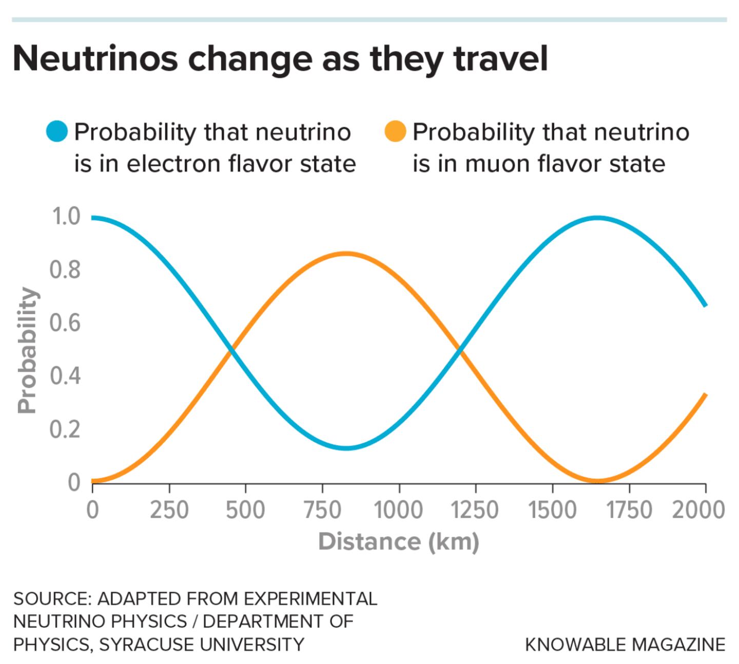 Experiments, however, have shown that neutrinos "oscillate" as they travel, switching among three different identities — physicists call them "flavors": electron neutrino, muon neutrino and tau neutrino. Oscillation measurements have also revealed that different-flavored neutrinos have slightly different masses.