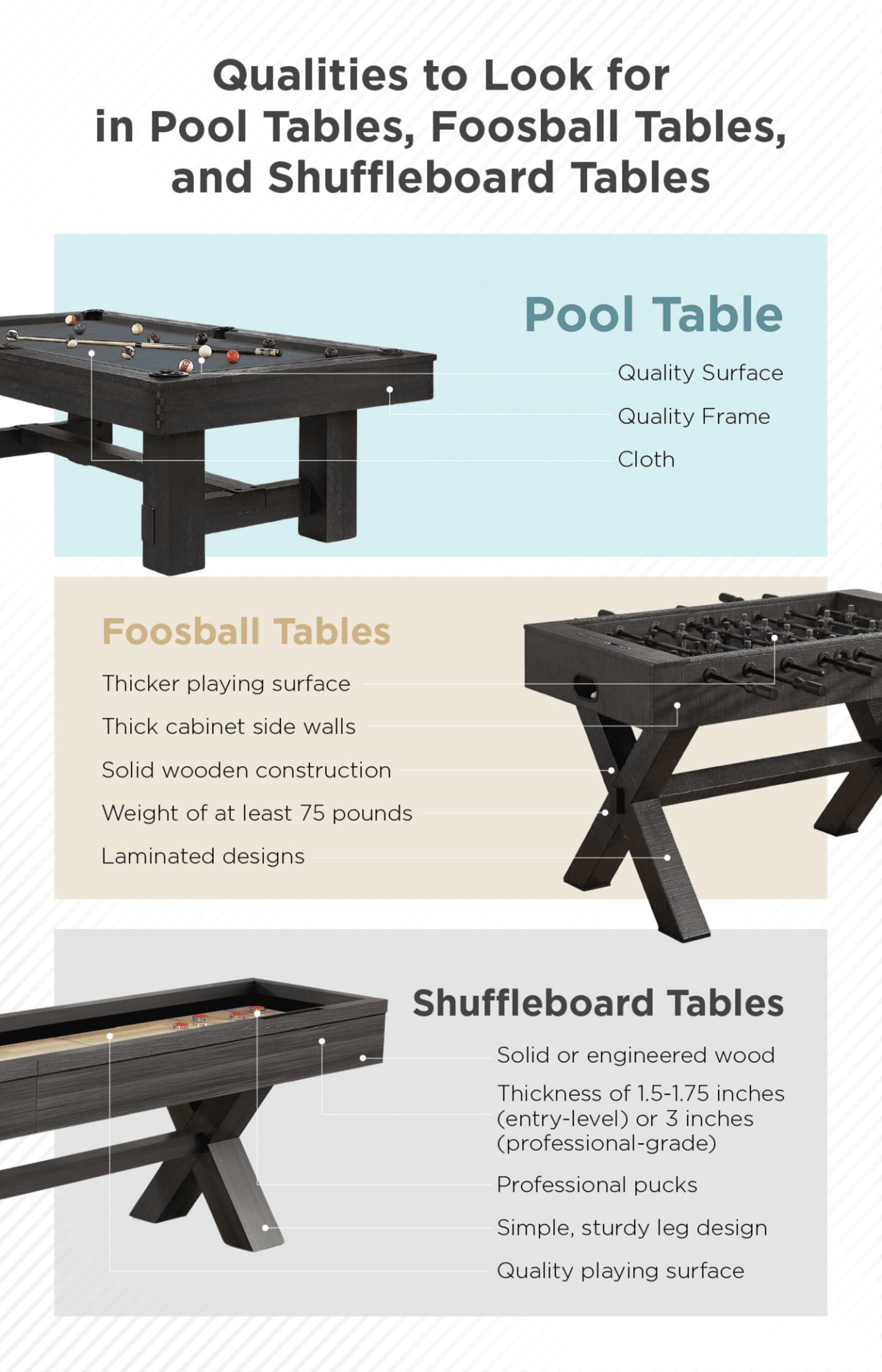 - Explore delivery and installation options: Pool, foosball and shuffleboard tables are big and heavy. It is wise to ask your retailer about delivery and installation options.