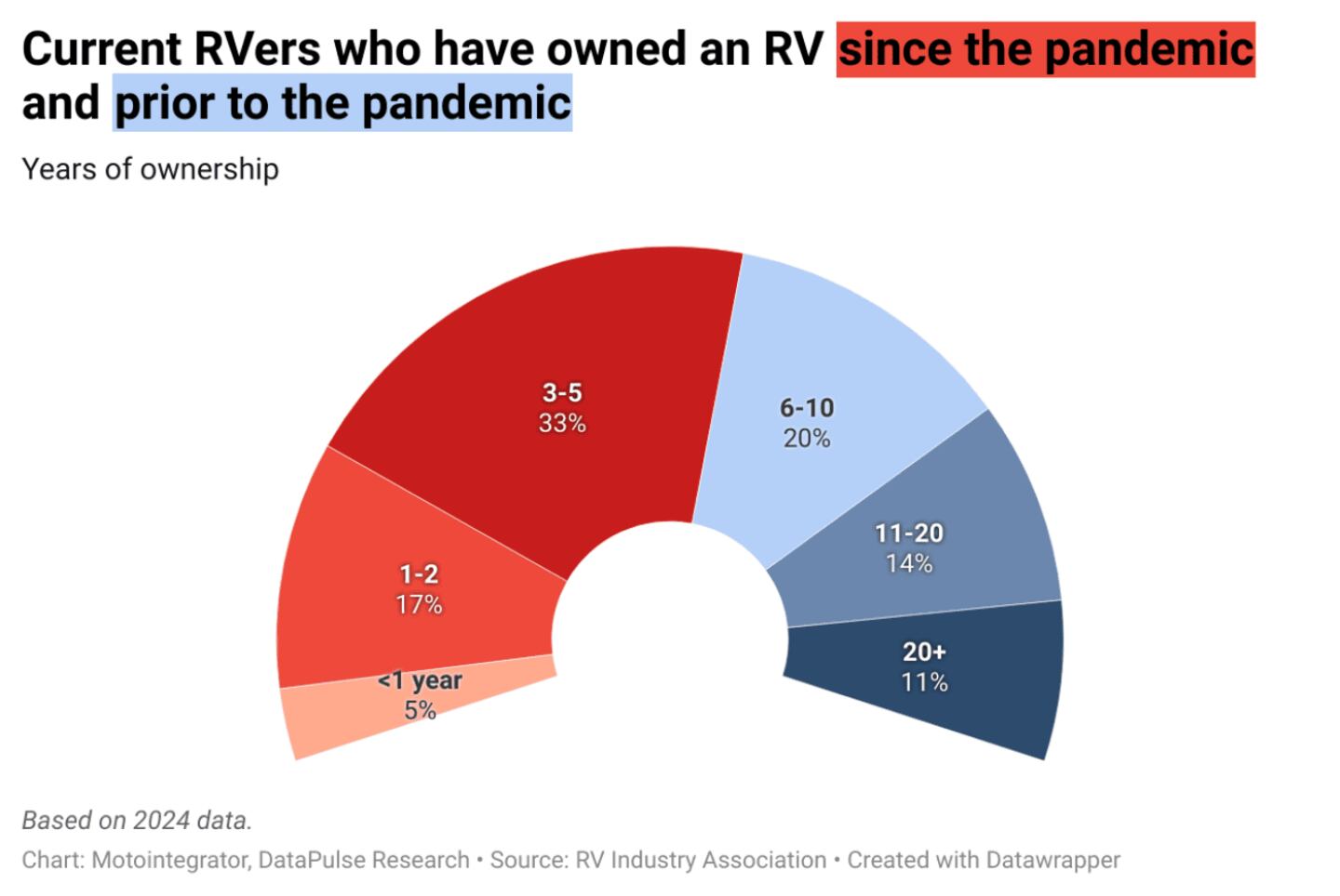 Nonetheless, many Americans did succeed in landing their own recreational vehicle. The race to get (or retrofit) RVs created an influx of newbie owners. As shown by the chart below, more than half (55%) of today’s RV owners are newbies who have owned their vehicle for just five years or less.