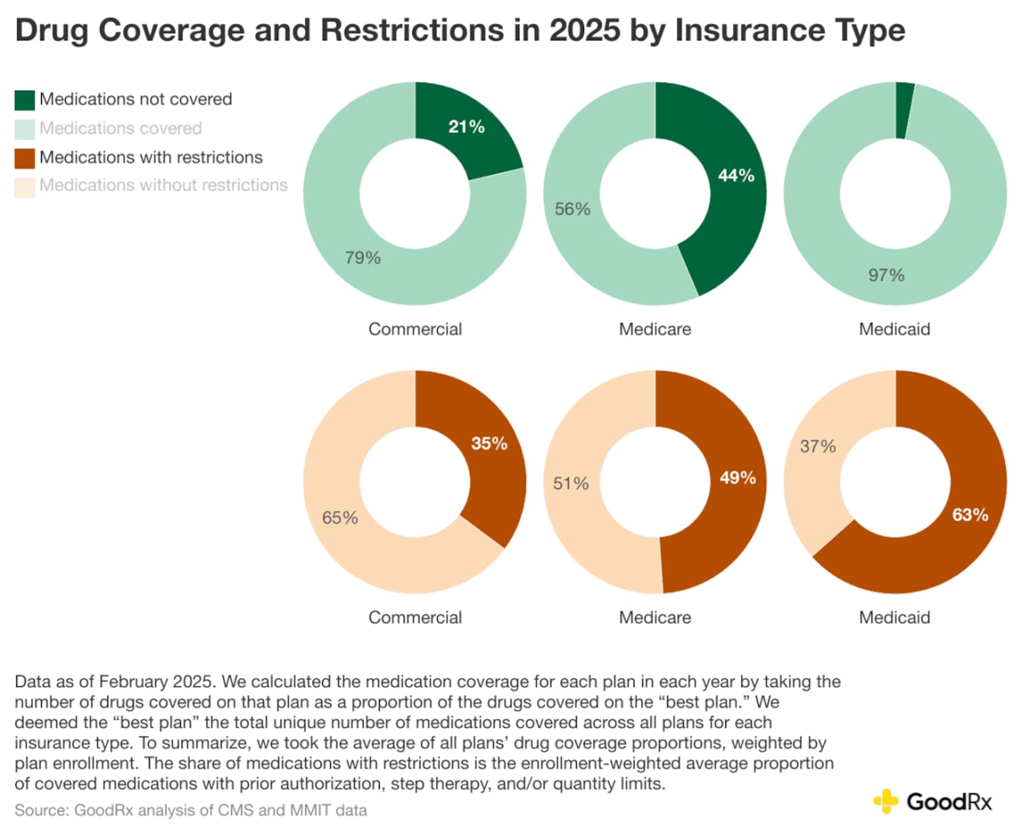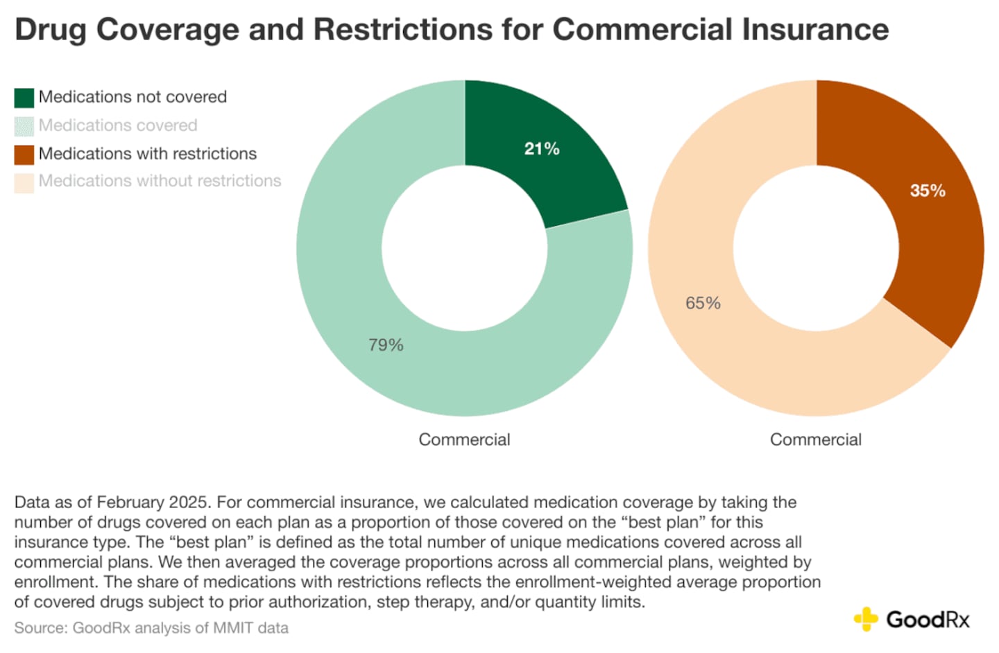 • For the average commercial insurance plan, 21% of medications have no coverage and 35% of covered medications have restrictions, like prior authorization.