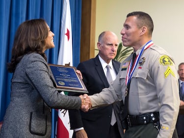 Through the years San Bernardino Sheriff's Corporal Rafael Ixco is congratulated by Attorney General Kamala Harris, after Gov. Jerry Brown, center, presented him with the Governor's Public Safety Officer Medal of Valor, Monday, Sept. 12, 2016, in Sacramento, Calif. Ixco was one of several law enforcement officers honored for their actions in the terrorist attack at a San Bernardino government building that left 14 dead and 22 wounded in December 2015. (AP Photo/Rich Pedroncelli)