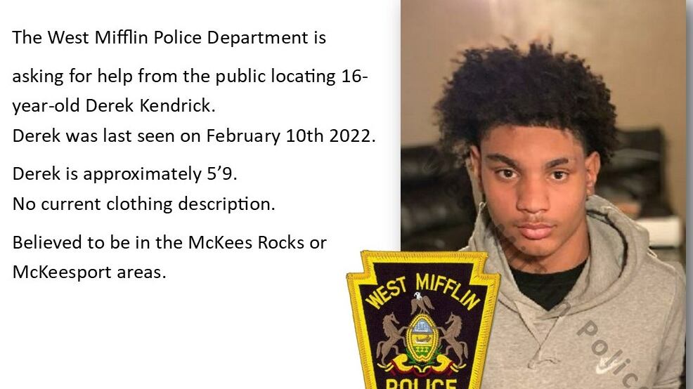 Anyone with information on Kendrick’s whereabouts are encouraged to call the West Mifflin Police Department at 412- 461-3125.
