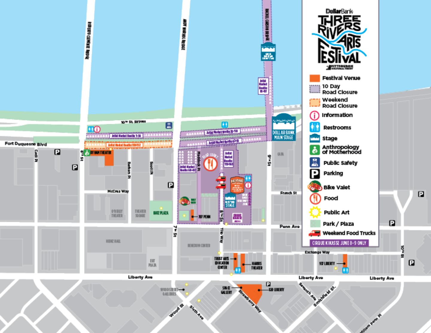 This year, the festival layout is expanding and incorporates the city’s iconic Three Sister Bridges. The layout is contained within a third of a mile in Pittsburgh’s 14-block Cultural District. You can see a map of the layout below.