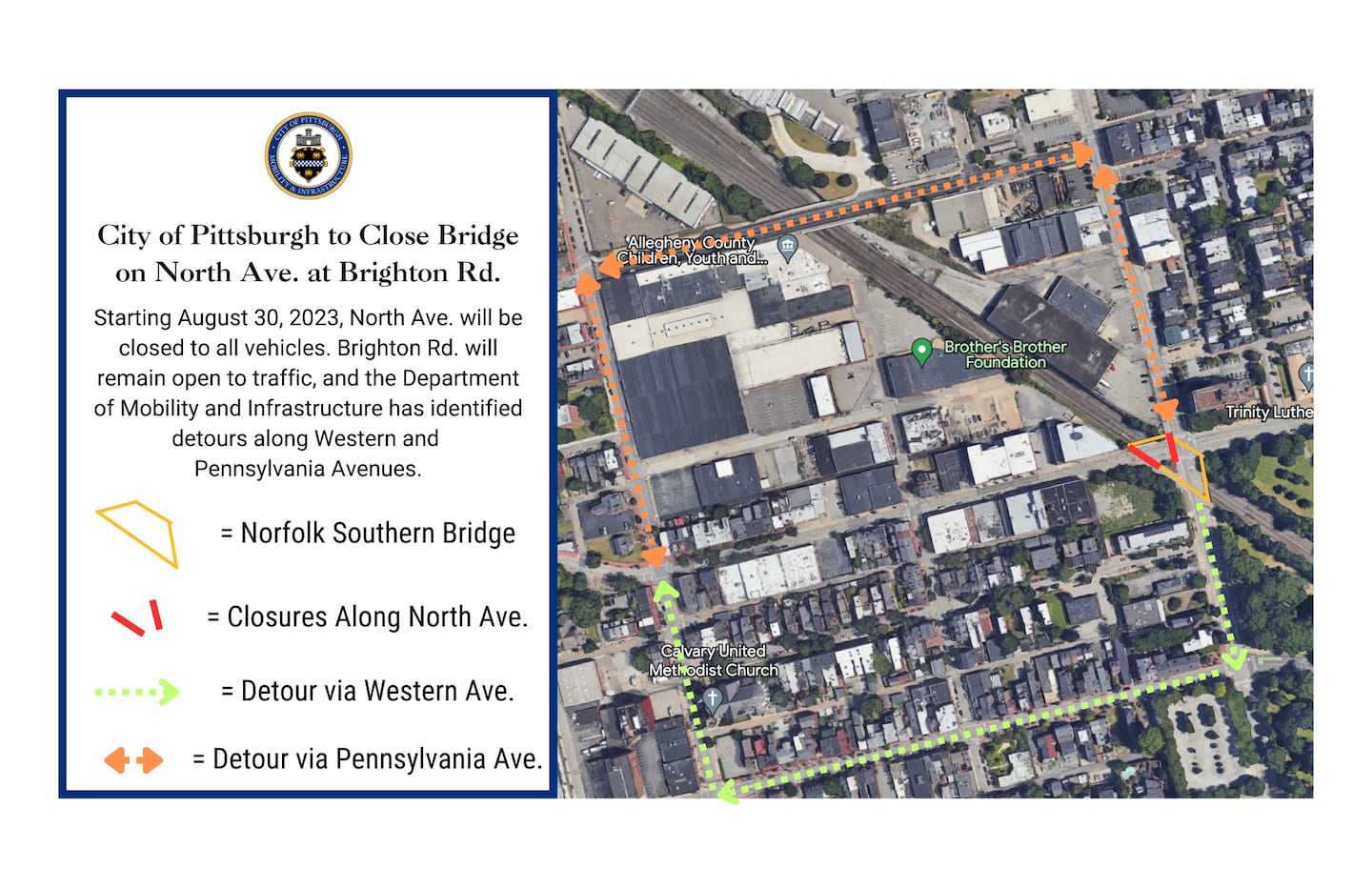 Brighton road will remain open, but all cars and trucks using North Avenue will have to detour to Pennsylvania and Western Avenues.