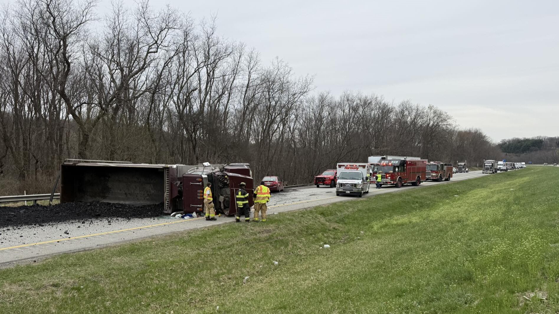 JACKSON TOWNSHIP, Pa. — A portion of Interstate 79 in Butler County was shut down Wednesday after a tri-axle overturned, spilling coal it was carrying all over the roadway.