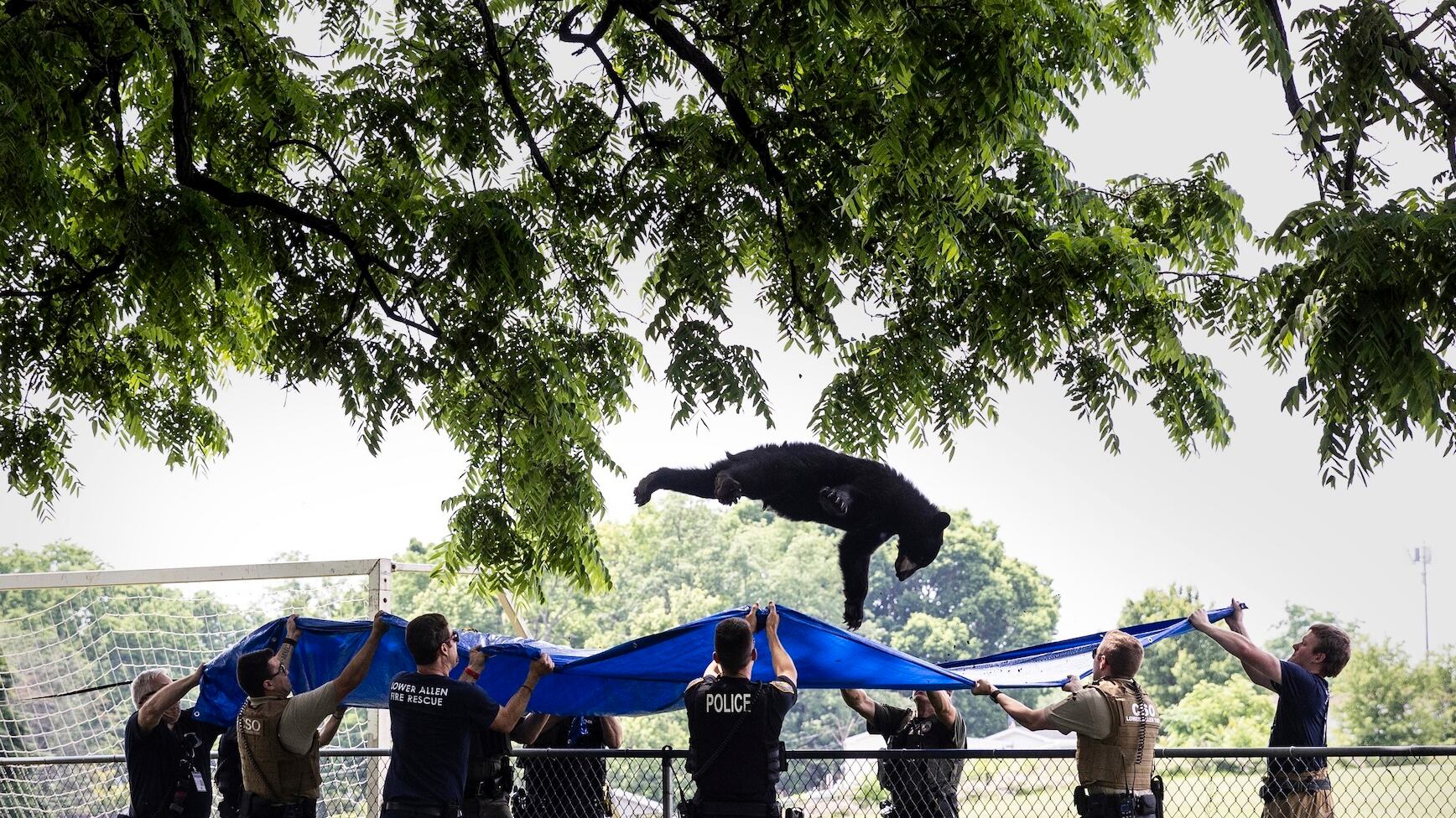 Fire crews brought a ladder truck, which allowed the warden to tranquilize the bear. Police officers and firefighters were in place with a tarp to catch the bear as the drugs took effect and it fell from its branch.