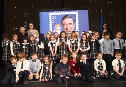 Joanne Rogers PITTSBURGH, PA - MARCH 23: Joanne Rogers pose for a photo along with students and staff during the U.S. Postal Service Dedication of the Mister Rogers Forever Stamp at WQED's Fred Rogers Studio on March 23, 2018 in Pittsburgh, Pennsylvani (Photo by Jason Merritt/Getty Images) (Jason Merritt/Getty Images)