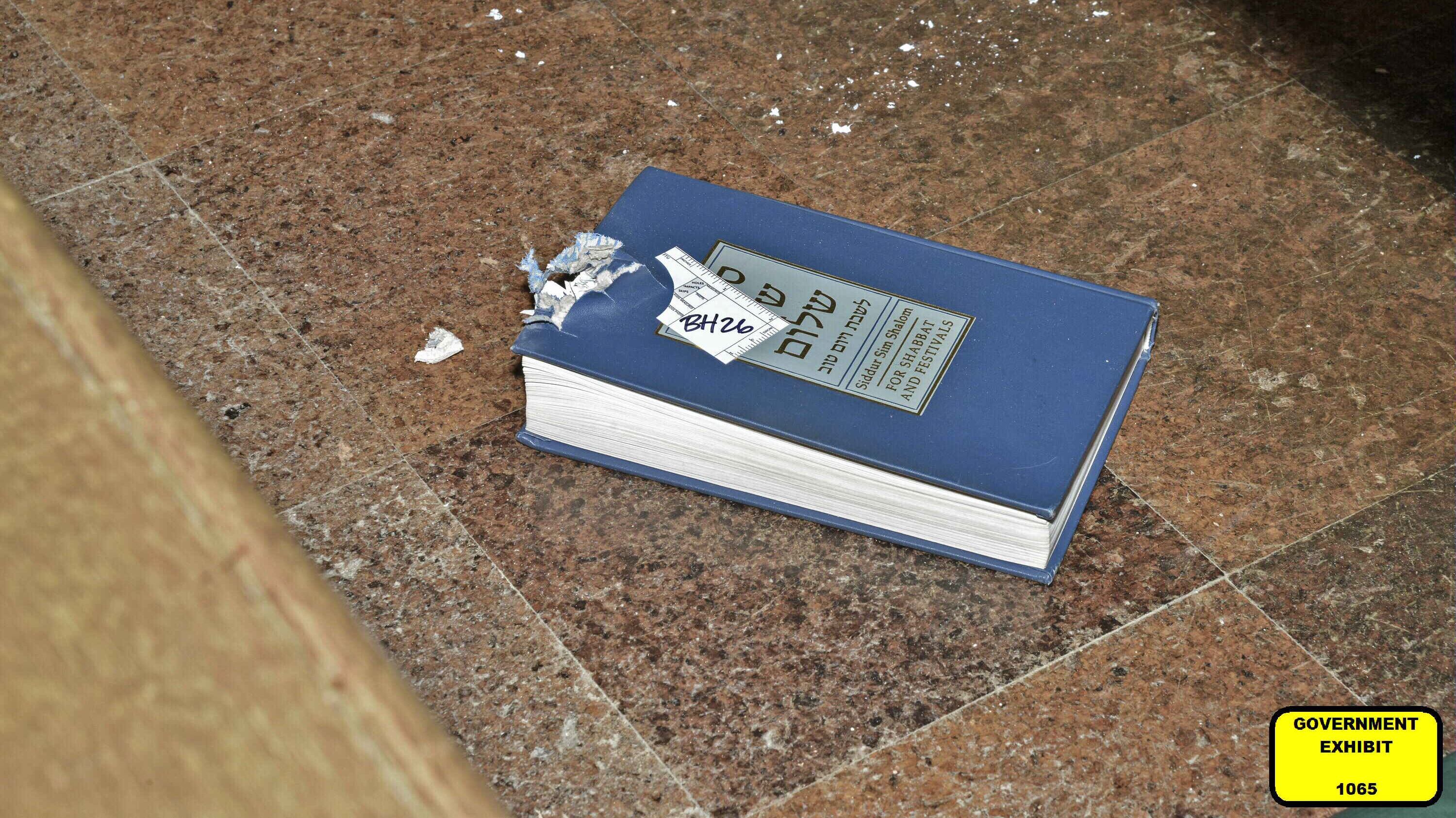 A prayer book torn by gunfire. A bullet-damaged glass door. A prayer shawl on a floor, a yarmulke on a stair, left where they had fallen from worshippers during the attack.