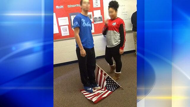 The photo, which appears to have been taken in a classroom setting, shows a young man standing on an American flag while a young woman standing beside him displays her middle finger and sticks out her tongue.