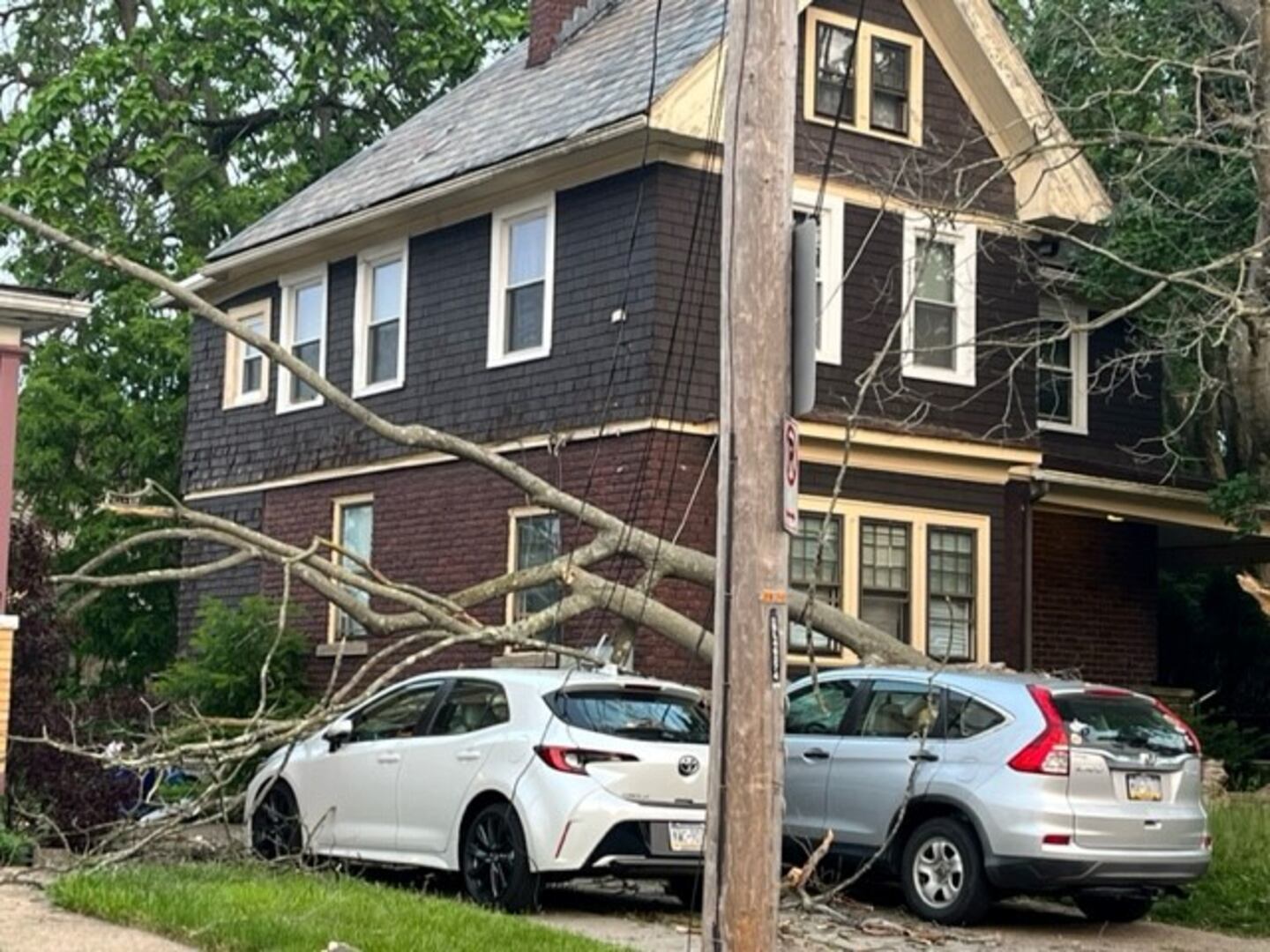 PHOTOS: Tree branch brings down utility wires, damages vehicles in Brookline