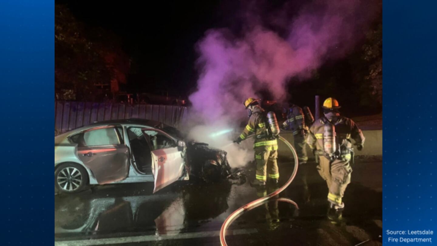 Flames destroyed a vehicle on Route 65 in Leetsale.