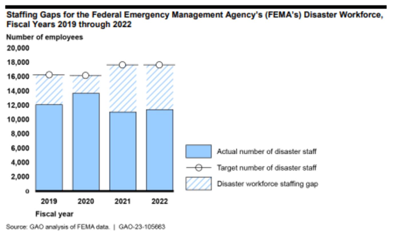A chart in the report illustrates the issue. The lighter blue area shows the shortage of FEMA staff. The gap is consistent. In 2022, for example, GAO said the agency was more than six-thousand disaster workers short.