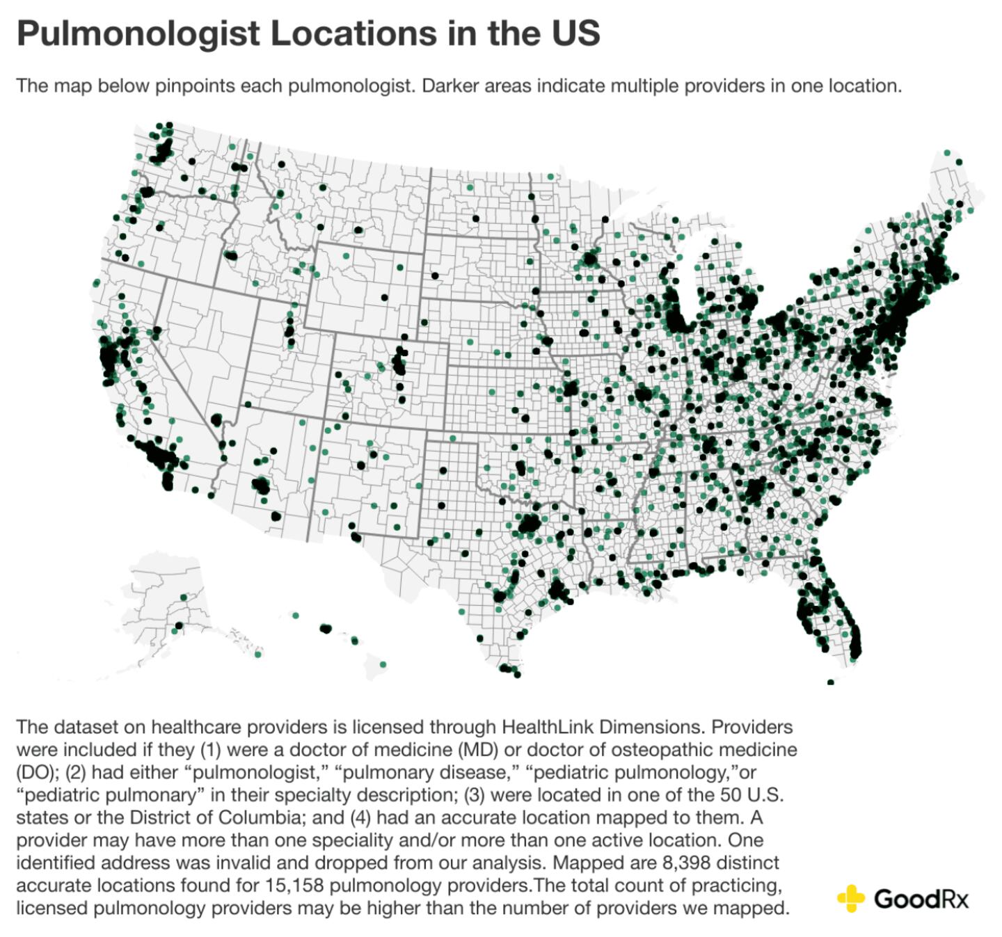 To identify areas that lack proper pulmonary care, the GoodRx Research team mapped 8,012 locations where pulmonologists practice across the country. Many locations, such as hospitals and specialty clinics, have more than one pulmonologist practicing at the same location.