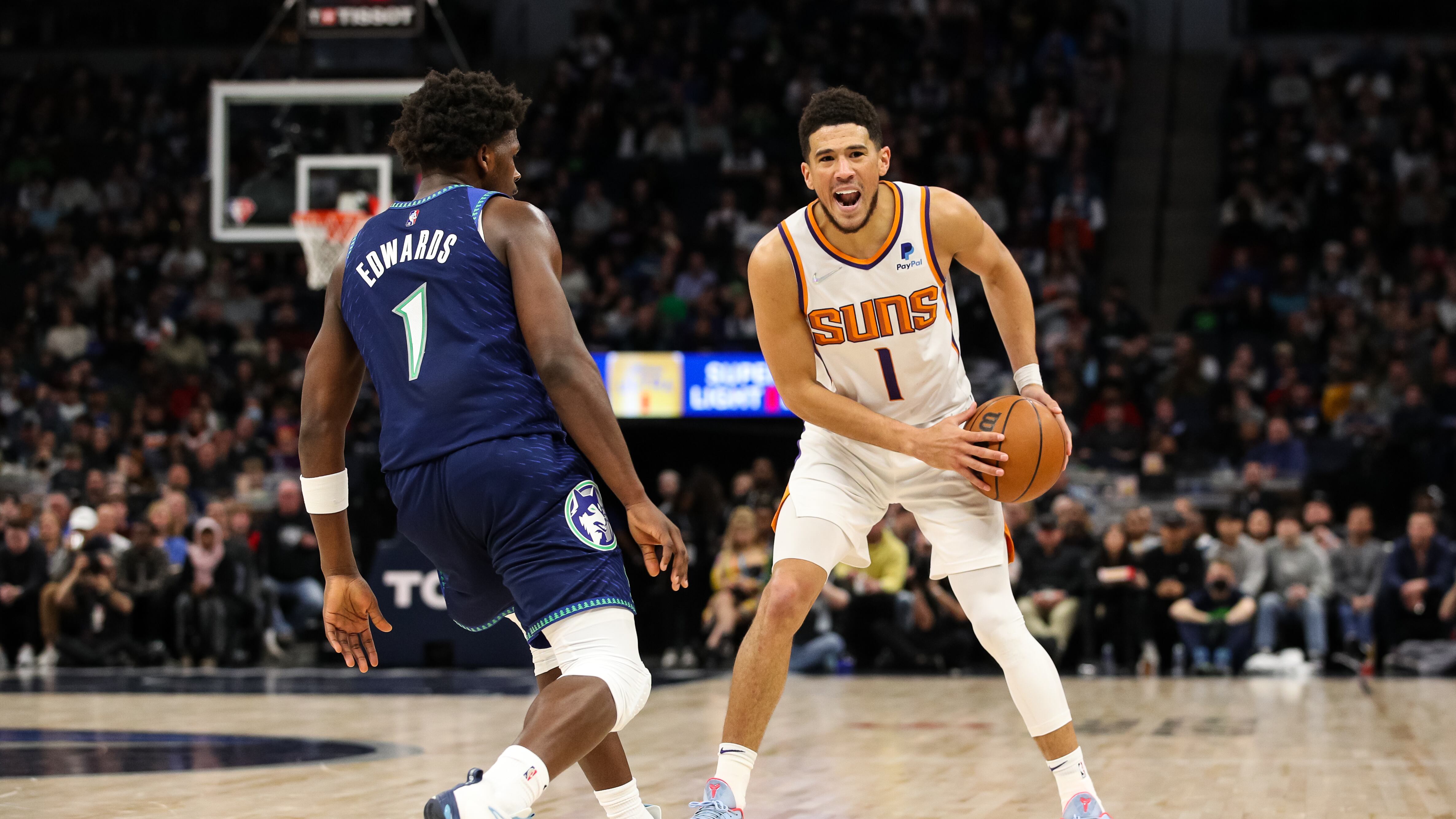 Phoenix Suns v Minnesota Timberwolves MINNEAPOLIS, MN - MARCH 23: Devin Booker #1 of the Phoenix Suns directs traffic while Anthony Edwards #1 of the Minnesota Timberwolves defends in the third quarter of the game at Target Center on March 23, 2022 in Minneapolis, Minnesota. The Suns defeated the Timberwolves 125-116. NOTE TO USER: User expressly acknowledges and agrees that, by downloading and or using this Photograph, user is consenting to the terms and conditions of the Getty Images License Agreement. (Photo by David Berding/Getty Images) (David Berding/Getty Images)