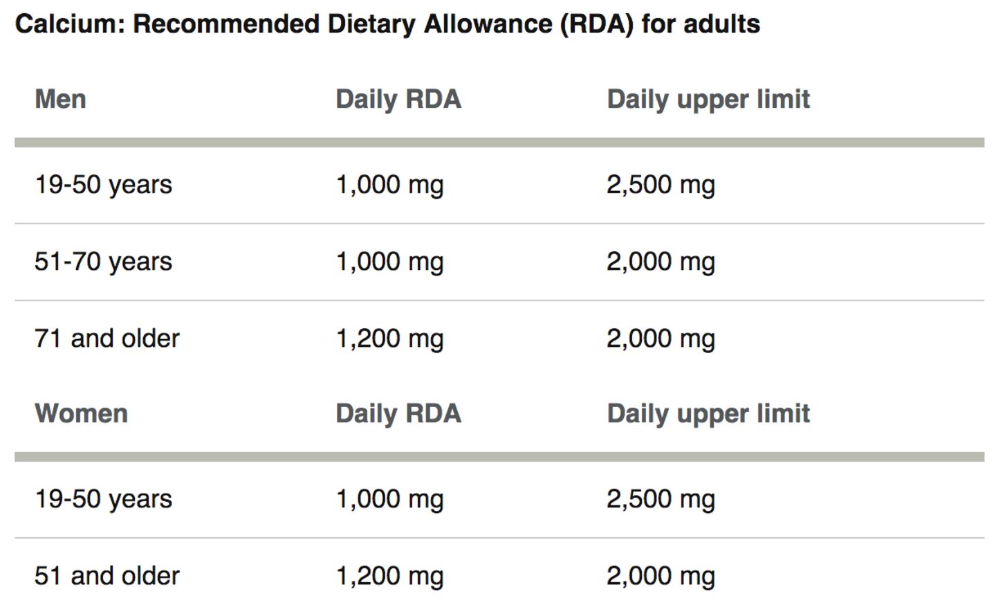 Recommended daily vitamin D and calcium intake for adults: