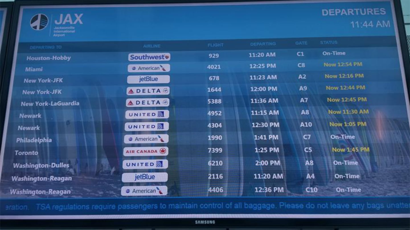 The following pictures from Jacksonville International Airport taken by Cox Washington correspondent Jamie Dupree show several delayed flights departing to locations like Boston and Miami.