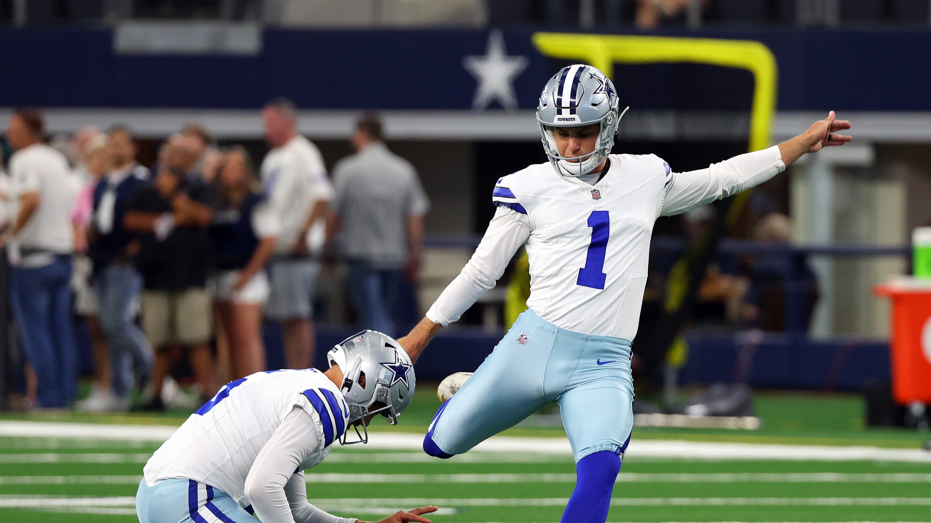 Las Vegas Raiders v Dallas Cowboys ARLINGTON, TEXAS - AUGUST 26: Brandon Aubrey #1 of the Dallas Cowboys takes practice kicks before a preseason game against the Las Vegas Raiders at AT&T Stadium on August 26, 2023 in Arlington, Texas. (Photo by Richard Rodriguez/Getty Images) (Richard Rodriguez/Getty Images)
