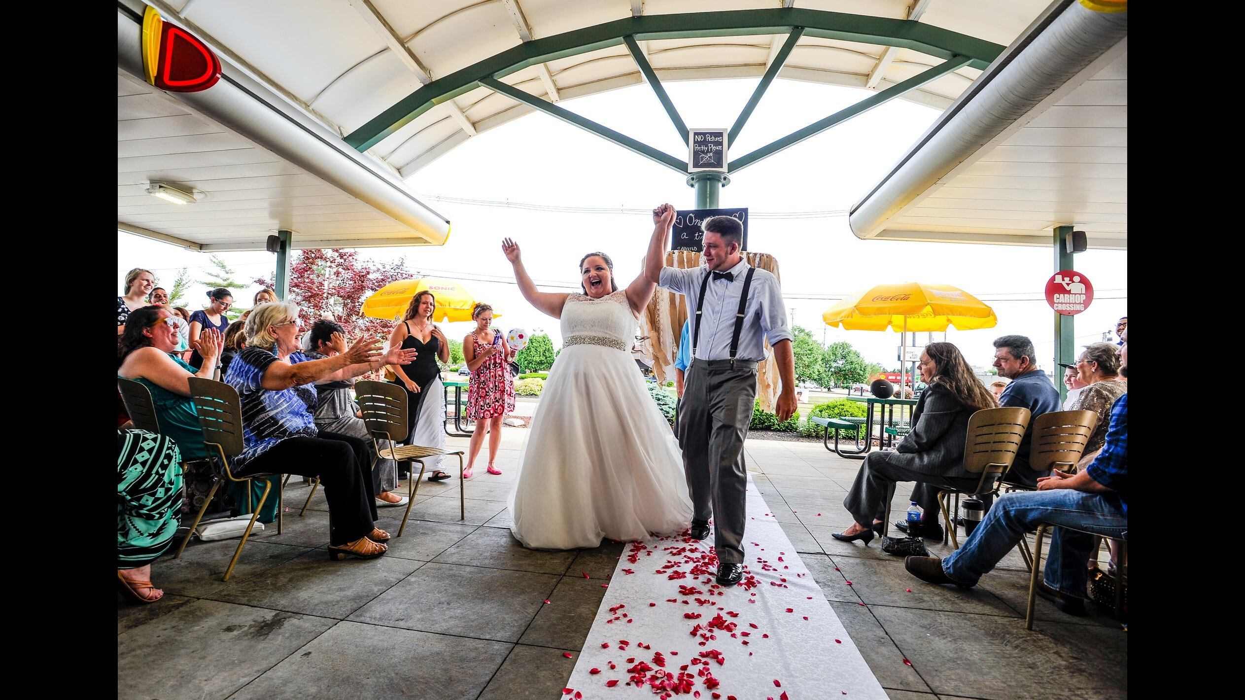 With cars honking approval and shout-outs from passersby, the bride and groom exchanged vows by a menu sign.