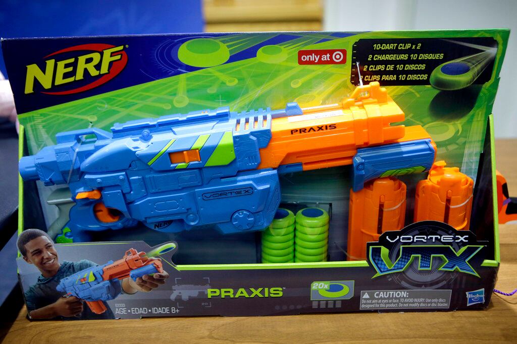 - Nerf Vortex VTX Praxis Blaster guns fire soft discs that have a potential for eye injuries.