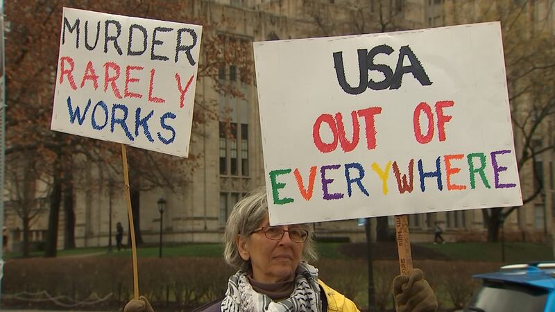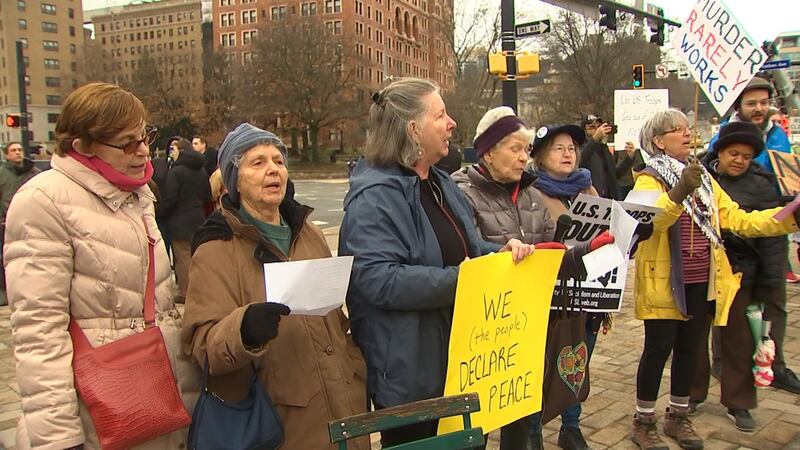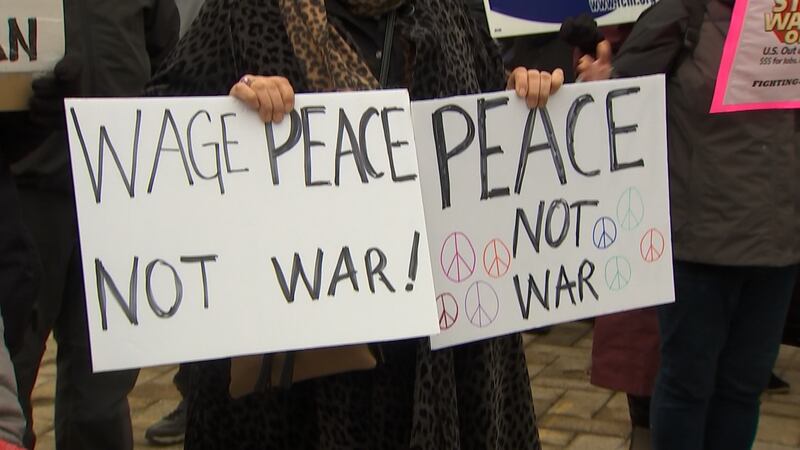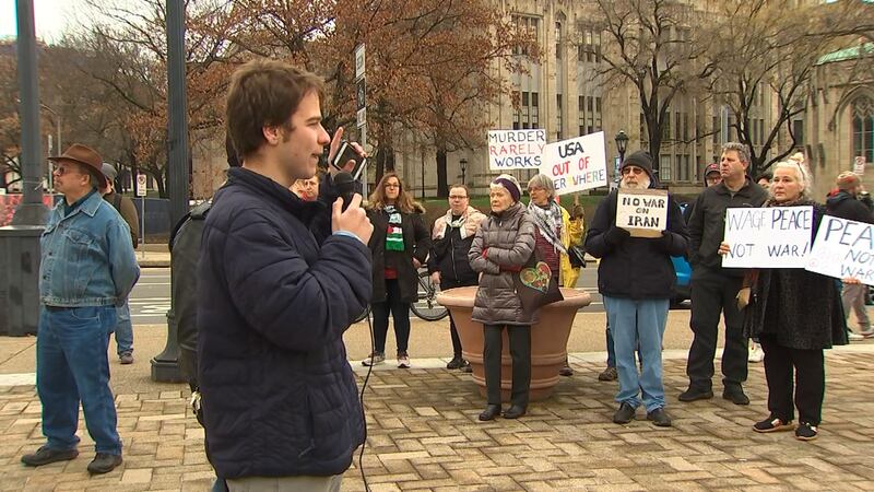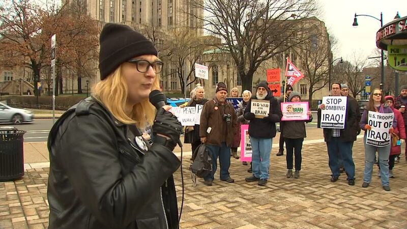 PITTSBURGH — More than a hundred people took part in an anti-war protest in Pittsburgh on Saturday. The protest followed the attack on the U.S. Embassy in Baghdad by militiamen on New Year’s Day and the death of a top Iranian military general by a U.S. airstrike in Baghdad. It was a peaceful protest before a fight broke out and police had to step in.