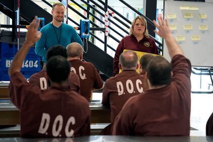 Prisoners with developmental disabilities face unique challenges. One facility is offering solutions Prison psychological specialists Christine Ransom, top right, and Randy Kulesza, top left, lead a group session for inmates, Dec. 14, 2023, in the Neurodevelopmental Residential Treatment Unit at Pennsylvania's State Correctional Institution in Albion, Pa. The prison unit is helping men with autism and their intellectual and developmental disabilities stay safe behind bars while learning life skills. The unit is the first in the state and one of only a handful nationwide. (AP Photo/Gene J. Puskar) (Gene J. Puskar/AP)