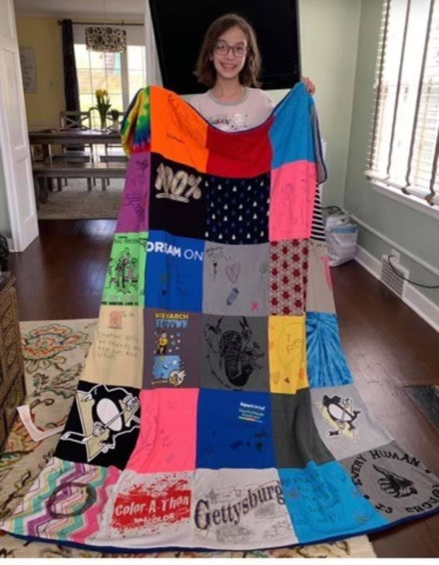 11-Year Old Layla Hockenberry spent much of the pandemic taking old, donated T-shirts and cutting them into 10-by-10 squares. She then pins them and sews them into blankets. She is then donating them to people in need, such as families after a house fire.