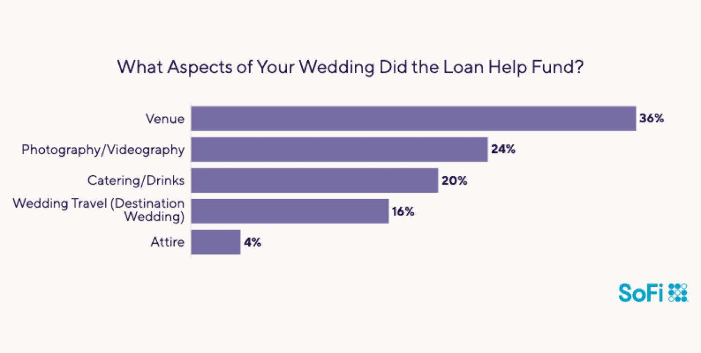More than 1 in3 couples (36%) put their loan proceeds toward securing the right venue for their ceremony or reception. Almost one quarter (24%) used the money to have the festivities captured on film or video. One in five spent the cash on drinks and catering for their guests.