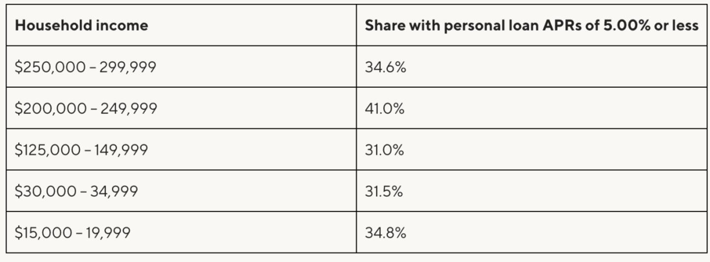 Usually, the people with higher incomes were the ones scoring loan rates under 5% — but not always. Almost 35% of people earning $15,000 to $19,999 reported similarly low APRs.