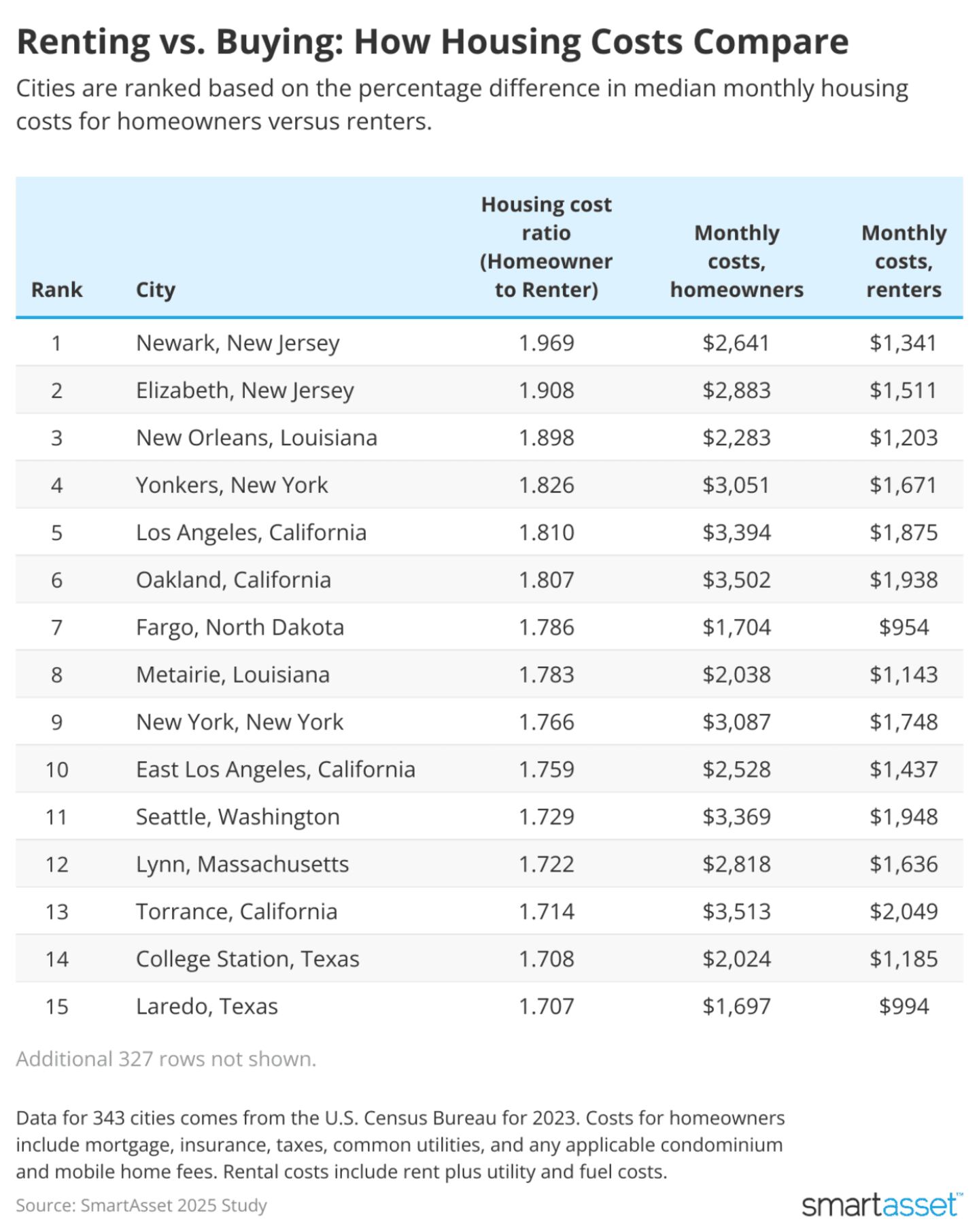 With this in mind, SmartAsset ranked 342 of the largest U.S. cities based on the median gross rental and housing costs residents face on a monthly basis—including add-ons like utilities, insurance, maintenance and taxes—to help people most accurately evaluate the ongoing costs of buying versus renting.