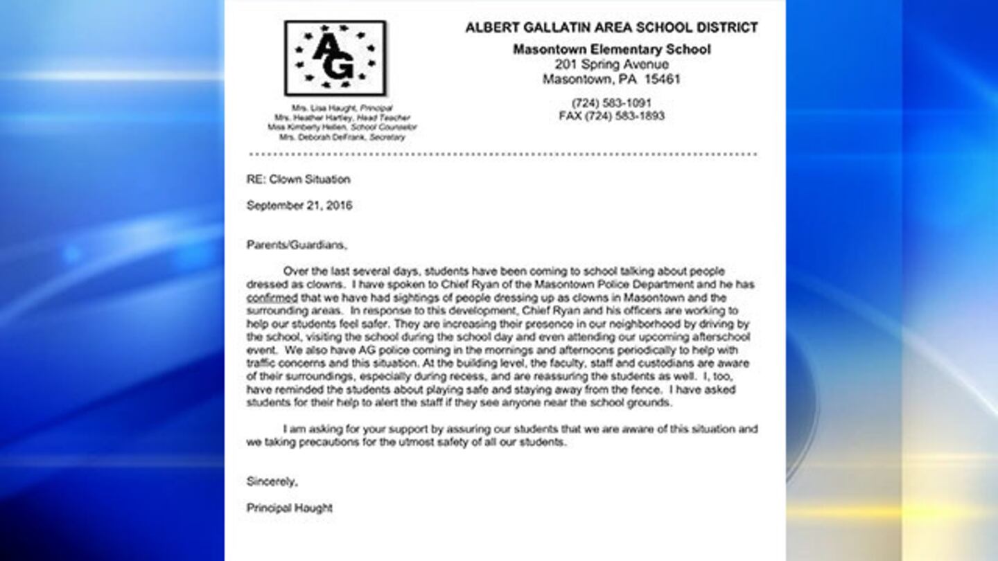 The Albert Gallitan Area School District's Masontown Elementary School sent a letter home to parents Wednesday detailing that students had been coming to school and talking about people dress as clowns. The Masontown police chief confirmed that there have been several sightings of people dressed as clowns in Masontown and surrounding areas. Police are responding with an increased presence at the school and around the neighborhood.