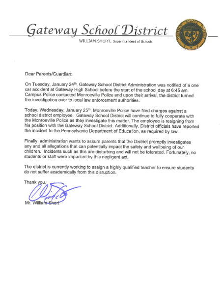 MONROEVILLE, Pa. — A Gateway High School teacher has resigned one day after he was involved in a DUI crash on school property.
