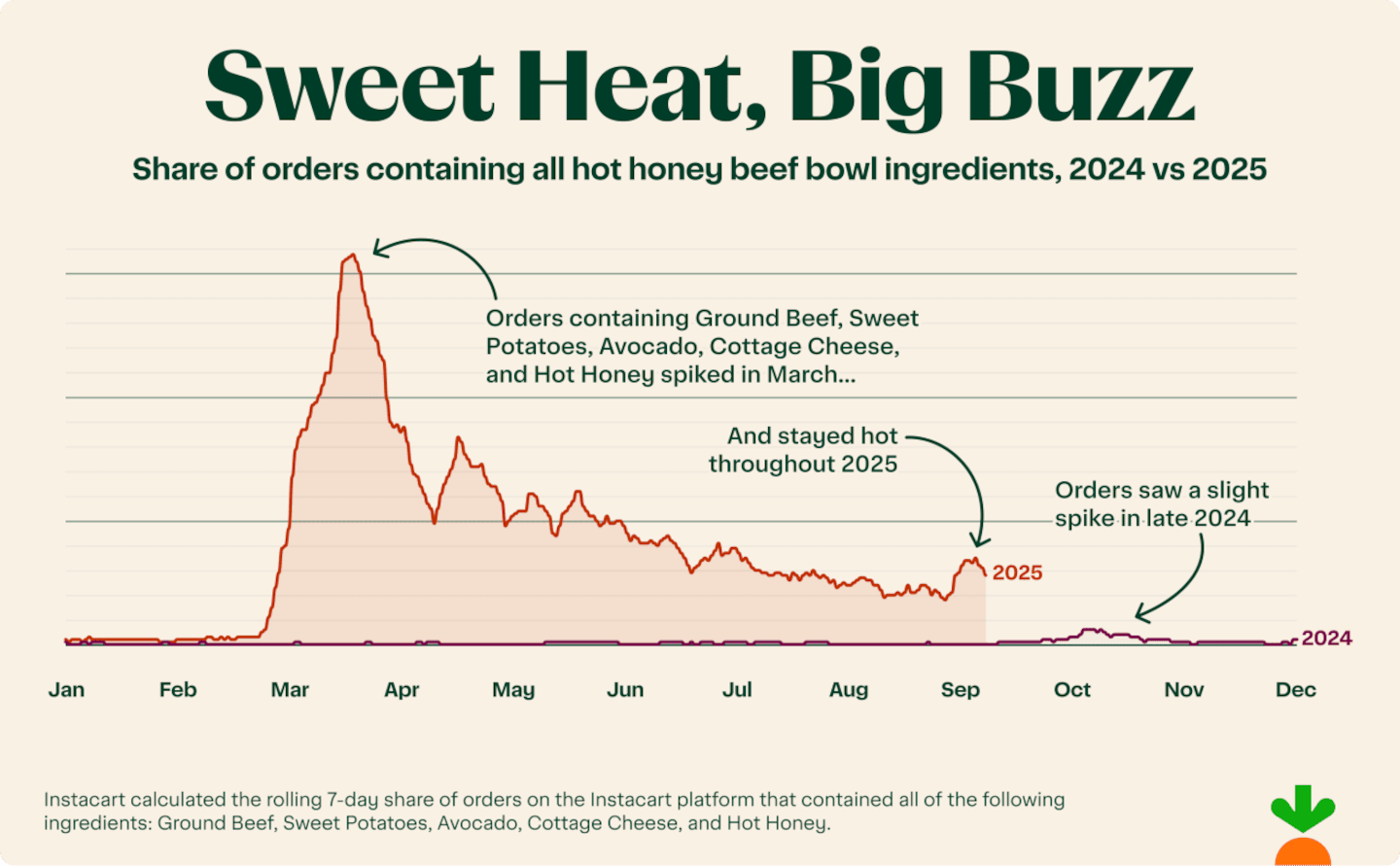 By tracking orders containing ground beef, sweet potatoes, avocado, cottage cheese, and hot honey, Instacart uncovered explosive growth. In March 2025, these ingredients took off in carts, reflecting a growing appetite for sweet-heat fusion and simple, protein-forward meals.