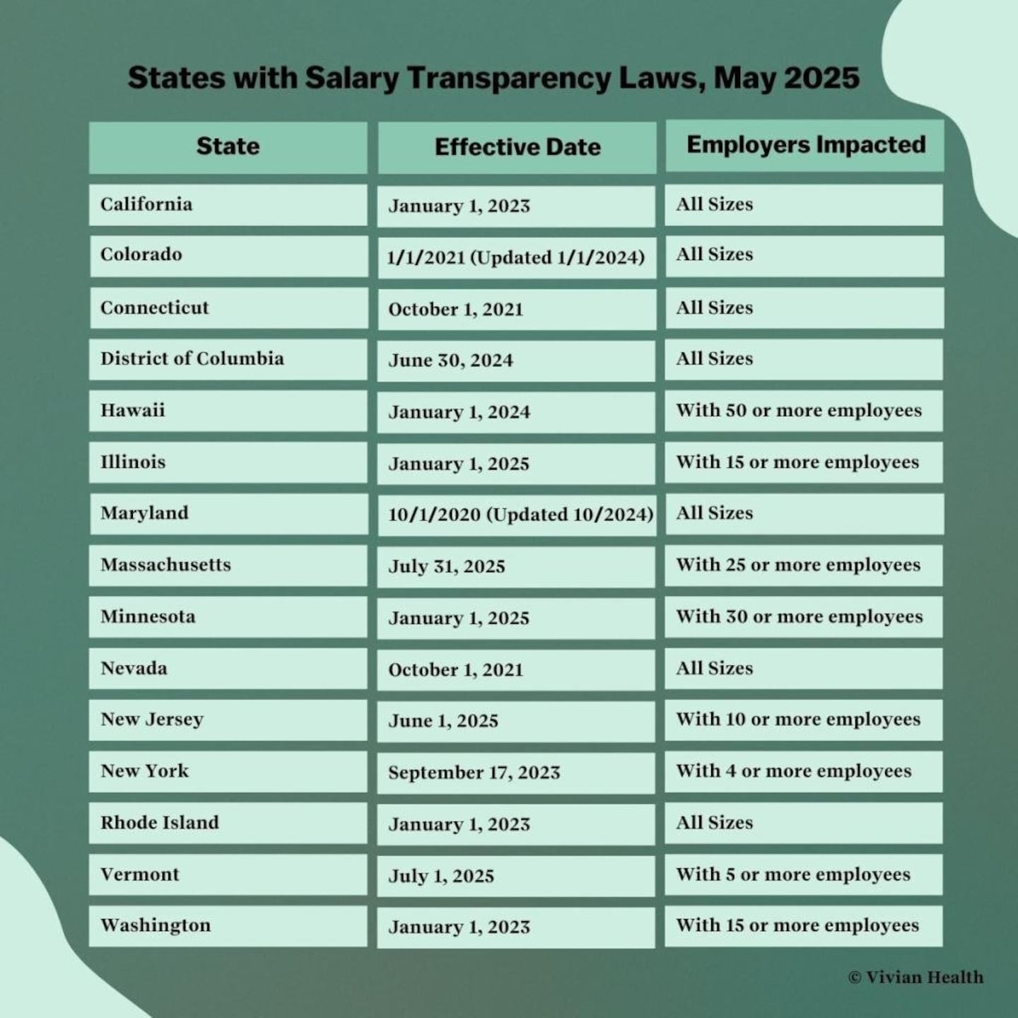 Salary transparency benefits every industry, including health care, where recruitment is fast-paced and hiring the best talent often hinges on pay. It's particularly helpful to travel nurses and other health care professionals due to the varying costs of living, especially housing costs, in different areas of the nation. Vivian Health dove into the legislation across all 50 states and the District of Columbia to learn which ones currently have salary transparency laws or plan to adopt regulations in the near future. Vivian provides essential details on what's included in existing laws to help health care and other workers reduce pay gaps and make more informed career decisions.
