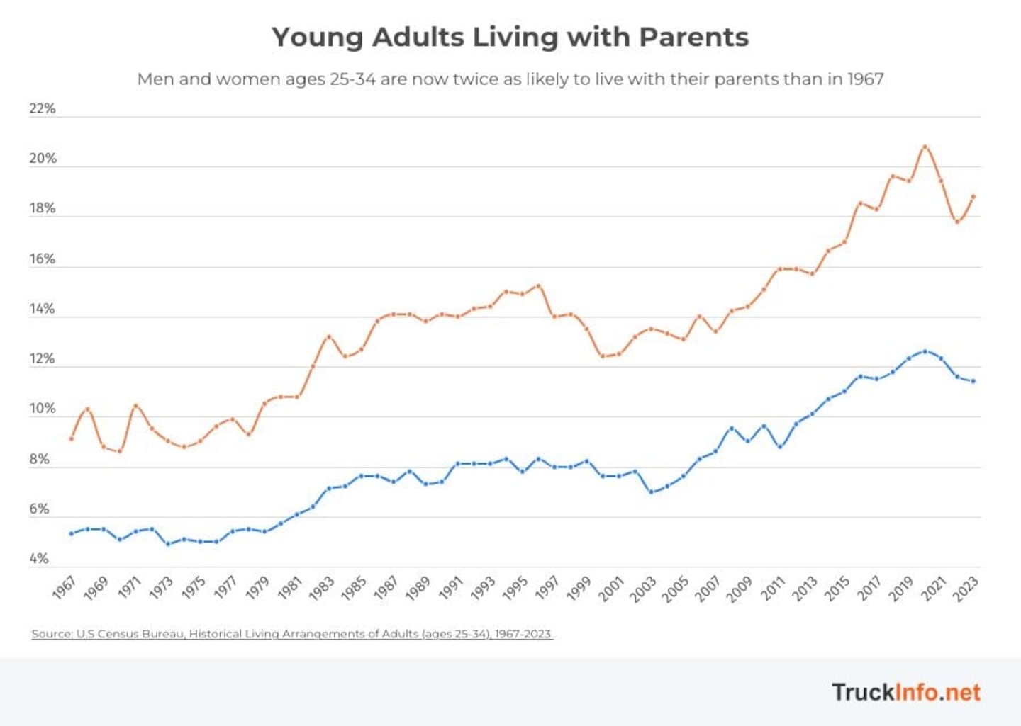 To better understand why and where adult children live with their parents, researchers at TruckInfo.net analyzed data from the U.S. Census Bureau, the Bureau of Labor Statistics, and the Federal Reserve. They found the following trends.