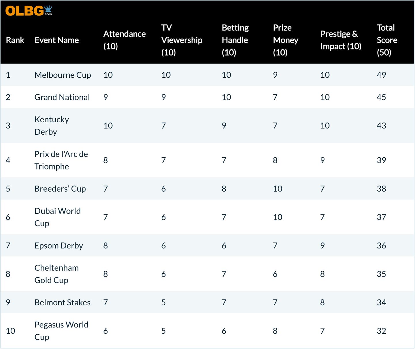 The Melbourne Cup tops the list with 49 points out of a possible 50. Held annually on the first Tuesday of November, the Melbourne Cup is an iconic Australian race and is often called "the race that stops a nation."