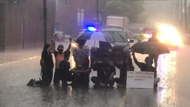 Rain did not deter protesters as they gathered outside the East Pittsburgh police station on June 20. Many chanted for justice and some were seen embracing police officers.