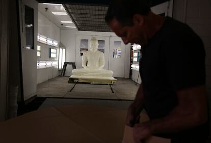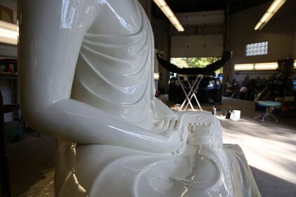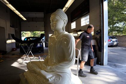 Pittsburgh Buddha statue A fiberglass statue of the Buddha is restored at Exoticars, an auto restoration shop specializing in classic vehicles, in McCandless, Pa., on Monday, Oct. 11, 2021. After weeks of repair and repainting, the statue was unveiled at the Pittsburgh Buddhist Center on Oct. 24. (AP Photo/Jessie Wardarski) (Jessie Wardarski/AP)