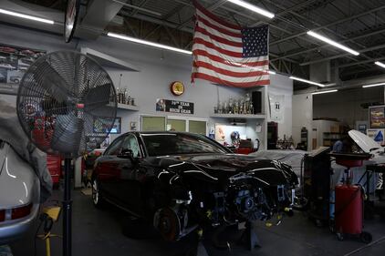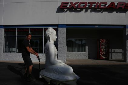 Pittsburgh Buddha statue Vehicles under repair sit parked in the garage of Exoticars, an auto restoration shop specializing in classic vehicles, in McCandless, Pa., on Monday, Oct. 11, 2021. (AP Photo/Jessie Wardarski) (Jessie Wardarski/AP)