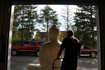 Pittsburgh Buddha statue Dave Ley, co-owner of Exoticars, an auto restoration shop specializing in classic vehicles, cuts out a template for the new base of large statue of the Buddha in McCandless, Pa., on Monday, Oct. 11, 2021. After weeks of restoration, the statue, originally manufactured in Sri Lanka, was unveiled at the Pittsburgh Buddhist Center on Oct. 24. (AP Photo/Jessie Wardarski) (Jessie Wardarski/AP)