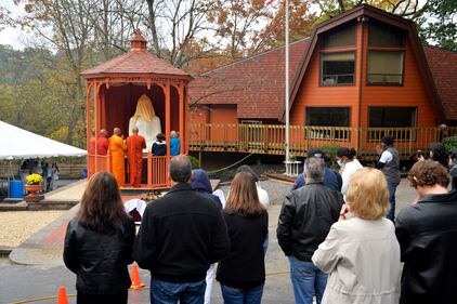 Pittsburgh Buddha statue Monks and others gather for the unveiling of a newly restored Buddha statue at the Pittsburgh Buddhist Center in West Deer, Pa., on Sunday, Oct. 24, 2021. The statue recently underwent restoration at Exoticars, which specializes in refurbishing classic automobiles. (T. Sarath Fernando via AP) (T. Sarath Fernando/AP)