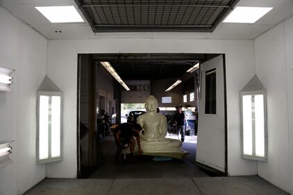 Pittsburgh Buddha statue Workers pull a newly restored statue of the Buddha into the paint booth at Exoticars, an auto restoration shop specializing in classic vehicles, in McCandless, Pa., on Monday, Oct. 11, 2021. After weeks of repair and repainting, the statue, originally manufactured in Sri Lanka, was unveiled at the Pittsburgh Buddhist Center on Oct. 24. (AP Photo/Jessie Wardarski) (Jessie Wardarski/AP)