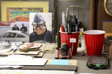 Pittsburgh Buddha statue A figurine of the Buddha sits on the desk of Dave Ley, co-owner of Exoticars, an auto restoration shop specializing in classic vehicles, in McCandless, Pa., on Monday, Oct. 11, 2021. The shop recently restored a larger statue of the Buddha for the Pittsburgh Buddhist Center, where it was unveiled Oct. 24. (AP Photo/Jessie Wardarski) (Jessie Wardarski/AP)