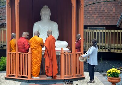 Pittsburgh Buddha statue Monks gather for the unveiling of a newly restored Buddha statue at the Pittsburgh Buddhist Center in West Deer, Pa., on Sunday, Oct. 24. 2021. The statue recently underwent restoration at Exoticars, which specializes in refurbishing classic automobiles. (T. Sarath Fernando via AP) (T. Sarath Fernando/AP)