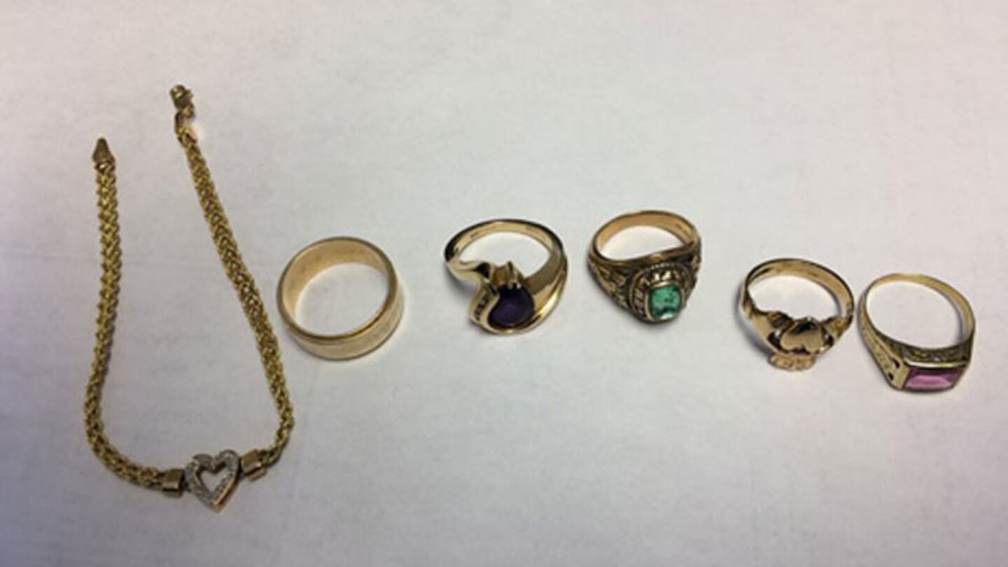 The items include a gold ring with “Jack 8-8-64” inscribed on the inside, as well as a Trafford High School class of 1985 ring.