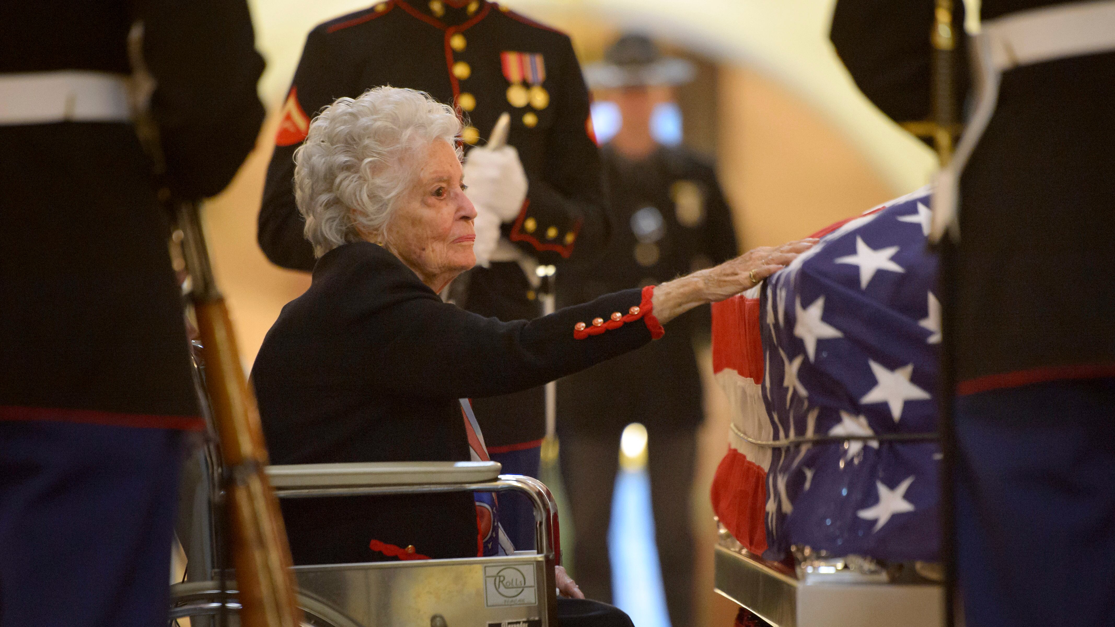 Annie Glenn joined hundreds of mourners at a public viewing for the first American to orbit Earth at the state Capitol in Columbus. Seated in a wheelchair, she put her outstretched hand on top of the flag-draped coffin.
