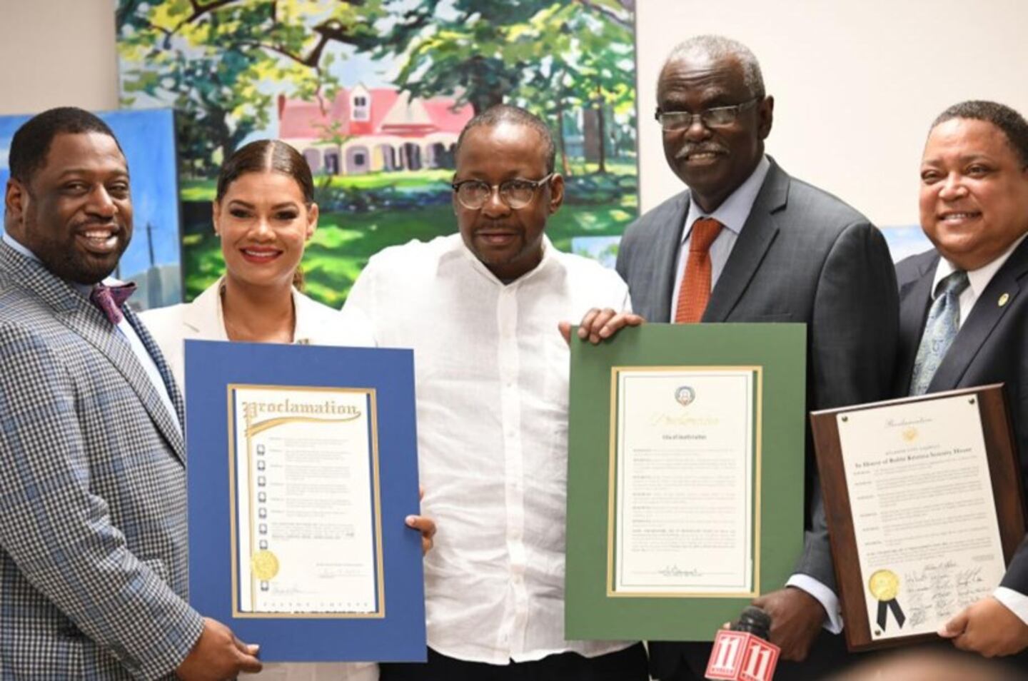 (L-R) Fulton County Commissioner Marvin Arrington, Jr., Alicia Etheredge-Brown, Bobby Brown, City of South Fulton Mayor ÃBillà Edwards, and City of Atlanta Councilman Michael Julian Bond onstage during Proclamation to Bobby Brown To Honor the Bobbi Kristina Serenity House at South Fulton City Hall on July 30, 2018 in City of South Fulton, Georgia. (Photo by Paras Griffin/Getty Images)